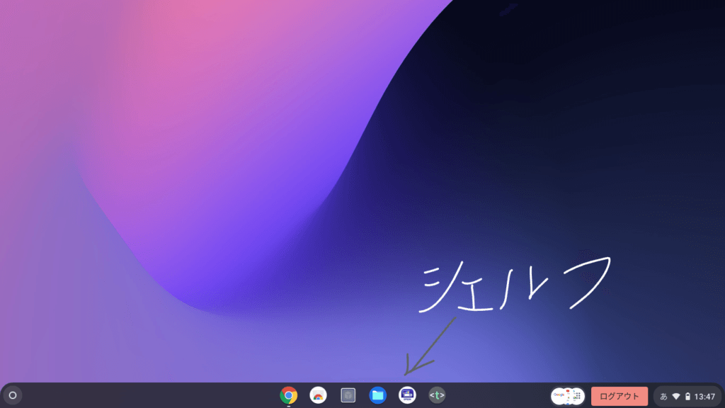 「デスクトップ」ではなく、その下にある「シェルフ」と呼ばれる部分にアプリやショートカットを配置する事ができます。