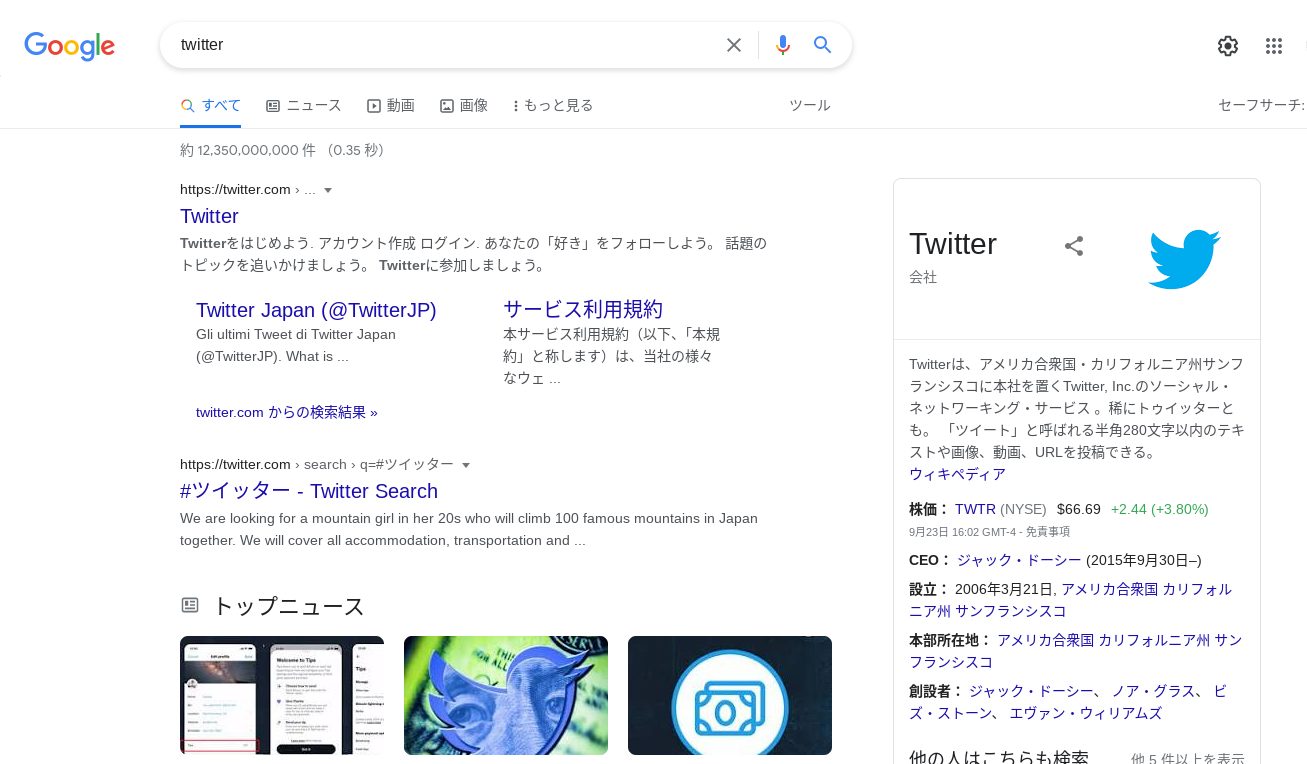 - まずは、Googleを開き「twitter」と検索します。 <- 普通にクリックすると、ブロックされていることを想定